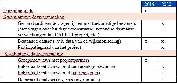 Het onderzoek heeft als doel om zowel de uitkomsten van het project als het proces te evalueren. Om hierop antwoorden te genereren werd gebruik gemaakt van een mixed-method aanpak met zowel kwantitatieve (enquêtes, monitoring) en kwalitatieve dataverzameling (diepte-interview) die elkaar versterken. Tabel 1 geeft een overzicht van de verschillende manieren van dataverzameling die doorheen het project uitgevoerd werden.