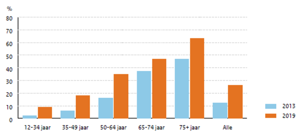 Hoewel e-fietsgebruik inmiddels minder sterk groeit onder oudere (65+) dan onder jongere groepen (65-), wordt de e-fiets steeds belangrijker voor ouderen. In 2019 legden 65-plussers ruim de helft (52%) van de fietskilometers af op een e-fiets. Onder 75-plussers lag dit aandeel hoger, op 63%. In 2013 ging dat nog om respectievelijk 39% en 47%, zie figuur 1. De manier waarop men een e-fiets gebruikt, verschilt met het gebruik van de normale fiets. Voor alle motieven geldt dat verplaatsingen met de e-fiets gemiddeld over een langere afstand gaan waarbij de snelheid gemiddeld hoger ligt. De verplaatsingen die ouderen (65+) per e-fiets maken zijn ongeveer 1,6 keer zo lang (in km) als verplaatsingen op de normale fiets. De gemiddelde snelheid ligt ongeveer 20% hoger. Het verschil in gemiddelde snelheid tussen de e-fiets en normale fiets is bij jongere gebruikers (65-) groter. Voor die groep ligt de gemiddelde snelheid met de e-fiets bijna 60% hoger dan de snelheid met de normale fiets.