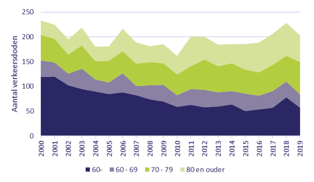 Er vallen relatief veel verkeersdoden en ernstige verkeersgewonden onder oudere fietsers. In 2019 vielen in totaal 203 doden onder fietsers. Bijna driekwart (72%) daarvan was 60 jaar of ouder en ruim de helft (59%) ouder dan 70 jaar. In figuur 2 is te zien, dat met name het aandeel 80-plussers onder de fietsdoden sinds 2010 is toegenomen: van 12% in 2010 tot 27% in 2019. Ter vergelijking, het bevolkingsaandeel van 80-plussers is ongeveer 5% (CBS).