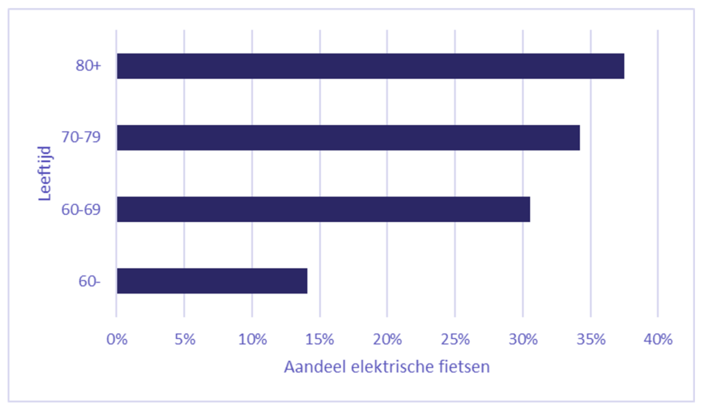 Met de komst van de e-fiets werd het mogelijk om met minder inspanning langere afstanden op de fiets af te leggen. In theorie heeft de e-fiets hiermee de potentie om auto- en ov-ritten te vervangen. Door de hogere snelheid en geringere inspanning is het aantal per e-fiets te bereiken bestemmingen groter dan bij de reguliere fiets. Bij de introductie van de e-fiets in Nederland toonden met name ouderen interesse in dat vervoermiddel, vooral met het oog op vrijetijdverplaatsingen. Mede als gevolg van de e-fiets is de totale fietsmobiliteit onder ouderen de afgelopen jaren gestegen. Naast een groei van het aantal ouderen in Nederland, steeg het gemiddelde aantal fietsverplaatsingen (normale fiets en e-fiets gecombineerd) die 65-plussers per persoon per dag maken tussen 2010 en 2019 met 8%. Daarnaast steeg de gemiddelde afstand die zij per verplaatsing afleggen met 9% (CBS, 2021).