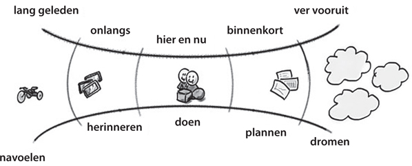 Het verleden ervaren we als een lineair pad tot het heden. In het hier en nu kunnen (en moeten) we concreet handelen. Voor de nabije toekomst kunnen we plannen maken en redeneren. Echter over de verre toekomst kunnen we niet precies zijn, omdat we gewoonweg niet kunnen voorspellen wat er zal gebeuren. Maar we kunnen wel dromen en praten over wat we belangrijk vinden: onze behoeften en waarden (zie figuur 1).