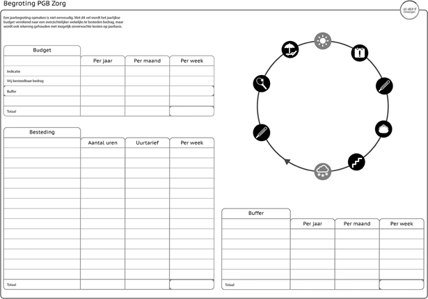 Samen met PGB bemiddelaars hebben we de vorm van het gesprek herontworpen en voorzien van een aantal invulbladen om alle aspecten, en het hele jaar, te bespreken (zie figuur 3). De aanpak bleek te werken, en is ondertussen verder opgepakt bij de PGB bemiddelaars van de deelnemende zorginstantie. Door de nieuwe tools ging het gesprek ook over dingen die al niet meer vanzelf op tafel kwamen, zoals dat iemand ook graag weer eens buiten zijn woning wilde komen.