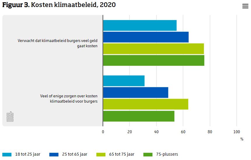 Twee derde van de bevolking van 18 jaar en ouder denkt dat het klimaatbeleid van de overheid burgers veel geld zal kosten. Vooral 65- tot 75-jarigen en 75-plussers verwachten dit (figuur 3). De helft van alle Nederlanders maakt zich hier ook zorgen over. Bij de 65- tot 75-jarigen is dit percentage met 64% het hoogst.