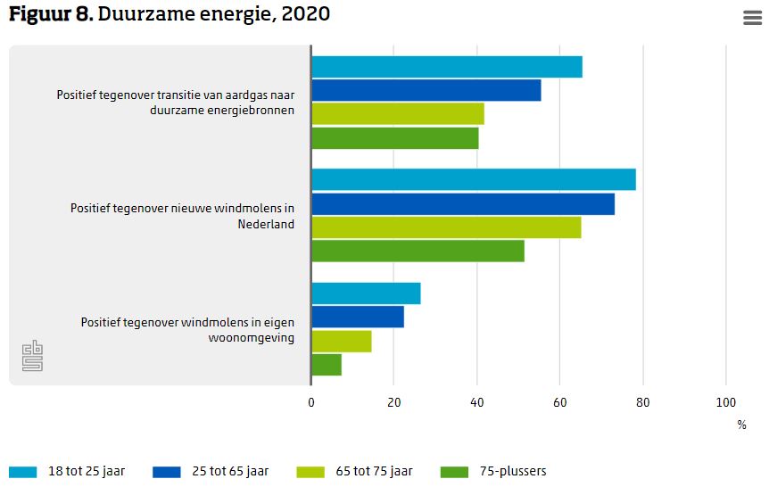 Windenergie is een bron van duurzame energie. Een ruime meerderheid van 71% is in het algemeen voor de bouw van nieuwe windmolens in Nederland; 14% is tegen. Belangrijkste argument van de tegenstanders is de horizonvervuiling. Het percentage voorstanders neemt af met leeftijd (figuur 8). Zo is 78% van de 18- tot 25-jarigen hierover positief, tegen 51% van de 75-plussers.