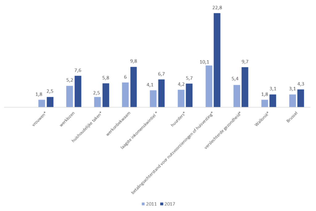 - Mensen die het moeilijk hebben om in hun basisbehoeften – zoals huisvesting of voeding – te voorzien meldden vaker onvervulde behoeften aan medische zorgen en hun situatie is ook erg verslechterd tussen 2011 en 2017: mensen die krap gehuisvest zijn (4,2% in 2011 en 8,4% in 2017), die moeite hebben om hun woning te verwarmen (9,6% in 2011 en 15,0% in 2017) of die zich niet regelmatig een evenwichtige maaltijd kunnen veroorloven (11,1% in 2011 en 16,5% in 2017). Personen met achterstallige betalingen voor energierekeningen en/of huisvestingslasten hebben het vaakst onvervulde behoeften aan medische zorg (10,1% in 2011 en 22,8% in 2017, vergeleken met slechts 0,9% in 2011 en 1,0% in 2017 bij mensen zonder betalingsachterstand);