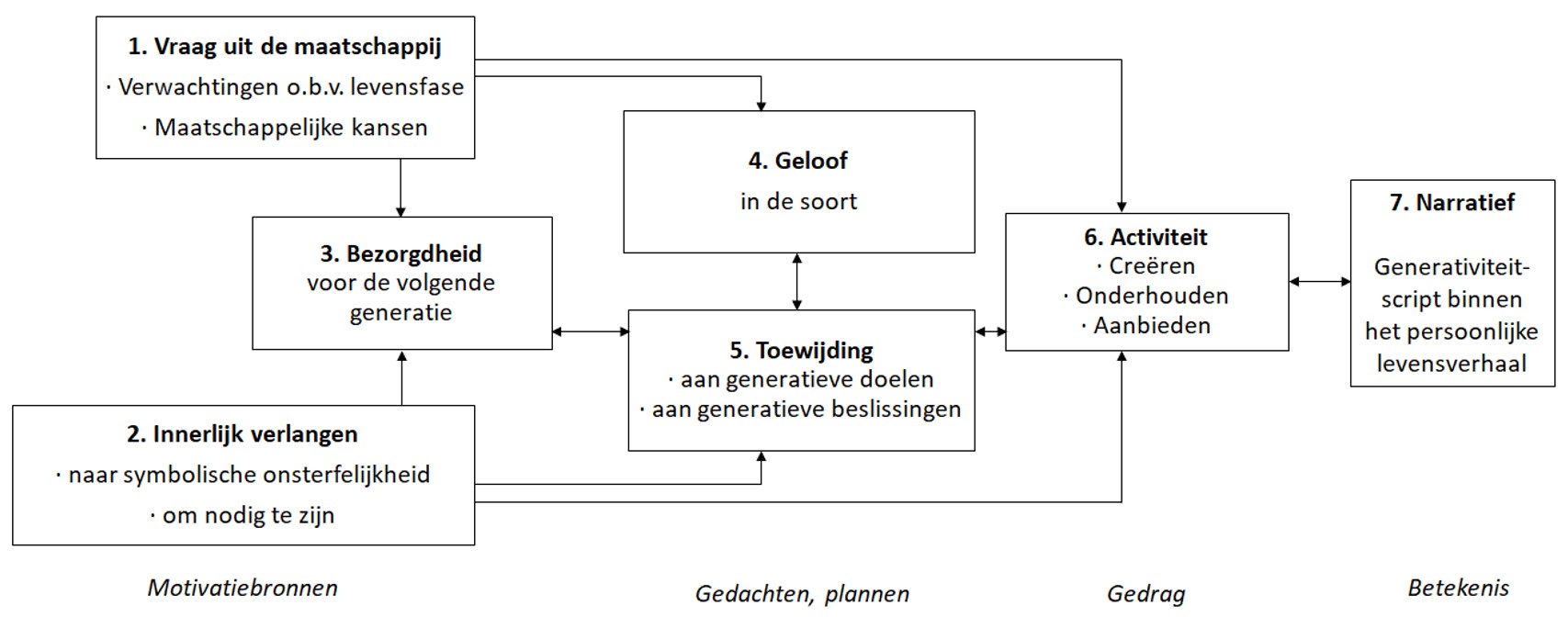 Tot de componenten die uiteindelijk kunnen leiden tot generatief gedrag behoren als eerste de vraag uit de maatschappij naar generativiteit (nr. 1 in figuur 1). Die vraag varieert met de levensfase. Van volwassenen wordt bijvoorbeeld meer generativiteit verwacht dan van jongeren, en van ouderen weer minder dan van jongere volwassenen. Daarnaast dient er sprake te zijn van een innerlijk verlangen om nodig te zijn voor de eigen gemeenschap en voort te leven in de volgende generatie(s), aangeduid als ‘symbolische onsterfelijkheid’ (nr. 2). De maatschappelijke vraag en het innerlijk verlangen dragen bij aan een algemenere bezorgdheid voor de volgende generatie (nr. 3). Samen vormen de eerste drie componenten de motivatiebronnen voor generatieve activiteit (nr. 6). Het model stelt ook dat een abstracter geloof in de mensheid als geheel (nr. 4) en de toewijding van de persoon aan concrete generatieve doelen en beslissingen (nr. 5) een rol speelt in het vertalen van de eerste drie componenten in daadwerkelijke generatieve activiteit.