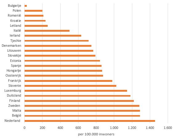 Figuur 1. Aantal mensen verblijvend in een verpleeg- of verzorgingshuis in EU-landen (2021)