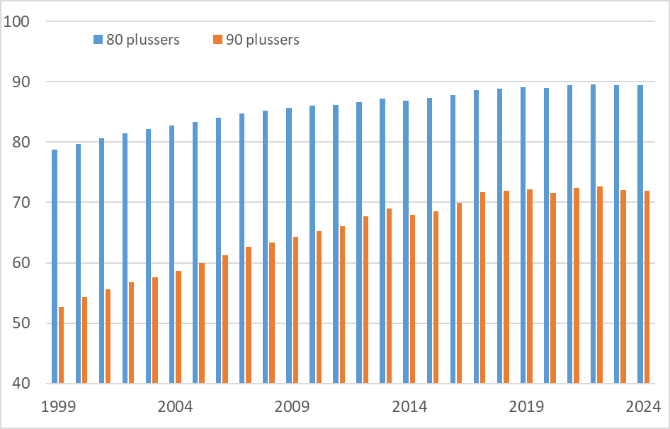 De afgelopen 25 jaar nam het aantal 80-plussers toe van 495.000 naar bijna 900.000. Het aantal 80-plussers dat in de Gemeentelijke Basisadministratie is ingeschreven bij een verzorgings- of verpleeghuis daalde in dezelfde periode van 105.000 naar 95.000. De afname heeft zich vooral bij ‘jongere’ leeftijdsgroepen (tot 90 jaar) en bij vrouwen voorgedaan, zo blijkt uit de cijfers. Bij mannen is in absolute aantallen juist sprake van een stijging. De gemiddelde leeftijd van mannen in verzorgingshuizen (bijna 84 jaar) is sinds de eeuwwisseling vrijwel constant. Bij vrouwen nam de gemiddelde leeftijd met 1 jaar toe tot ruim 86 jaar. Anno 2024 woont 11 procent van de 80-plussers en 28 procent van de 90-plussers permanent in een verpleeg- of verzorgingshuis.