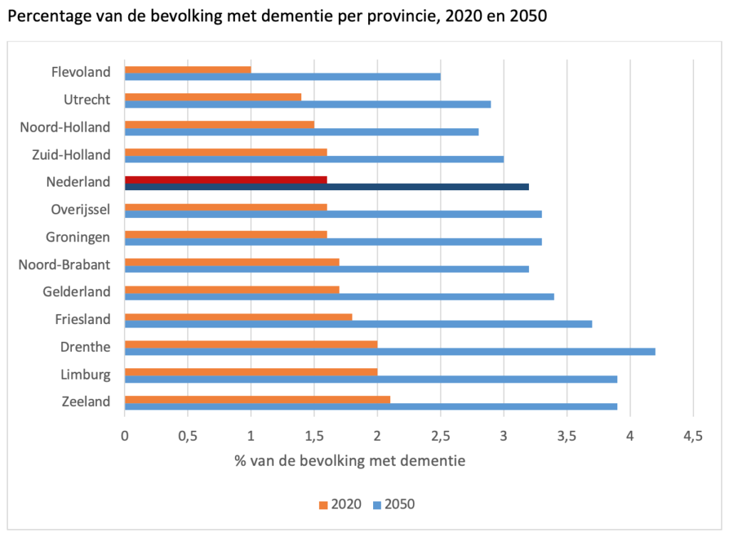 In 2050 is volgens de prognoses het aantal mensen met dementie 620.000. Dat is ruim 2,2 keer zo veel als in 2020. Het rijtje met koplopers is ongeveer hetzelfde als in 2020. Gecorrigeerd voor inwonertal is nu Drenthe de provincie met de meeste personen met dementie, gevolgd door Zeeland en Limburg. In Flevoland, Noord- en Zuid-Holland en Utrecht wonen in 2020 relatief gezien de minste mensen met dementie.