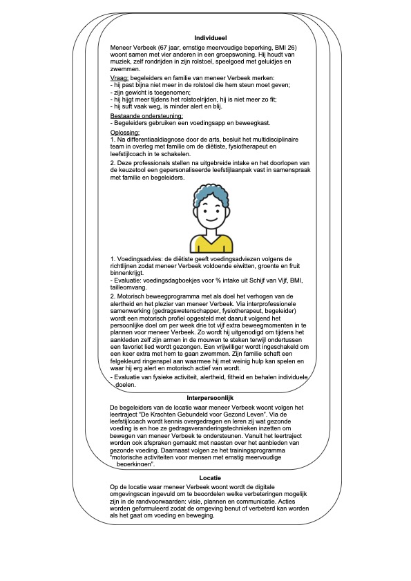 De ondersteuningsvraag op het gebied van een gezonde leefstijl is voor mensen met een verstandelijke beperking complex en vraagt om een langdurige en persoonlijke aanpak. Dit komt deels door de in elkaar grijpende gezondheidsproblemen en deels door de ondersteuning die mensen met een verstandelijke beperking nodig hebben van anderen (Naaldenberg e.a., 2013; Kuijken e.a., 2016; Bossink, 2019). Professionals, zoals begeleiders, verzorgden, verpleegkundigen, fysiotherapeuten en diëtisten, spelen een grote rol in het bevorderen van een gezonde leefstijl van mensen met een verstandelijke beperking. Daarnaast zijn de sociale en fysieke omgeving essentieel en randvoorwaardelijk. Zo is het van belang dat er beweegmaterialen aanwezig zijn of de mogelijkheid om gezond te koken, en kan de sociale en fysieke omgeving motiveren en stimuleren tot een gezonde leefstijl. Hierbij is het een randvoorwaarde dat er aandacht is voor gezond leven in plannen van cliënten, medewerkers en de organisatie.