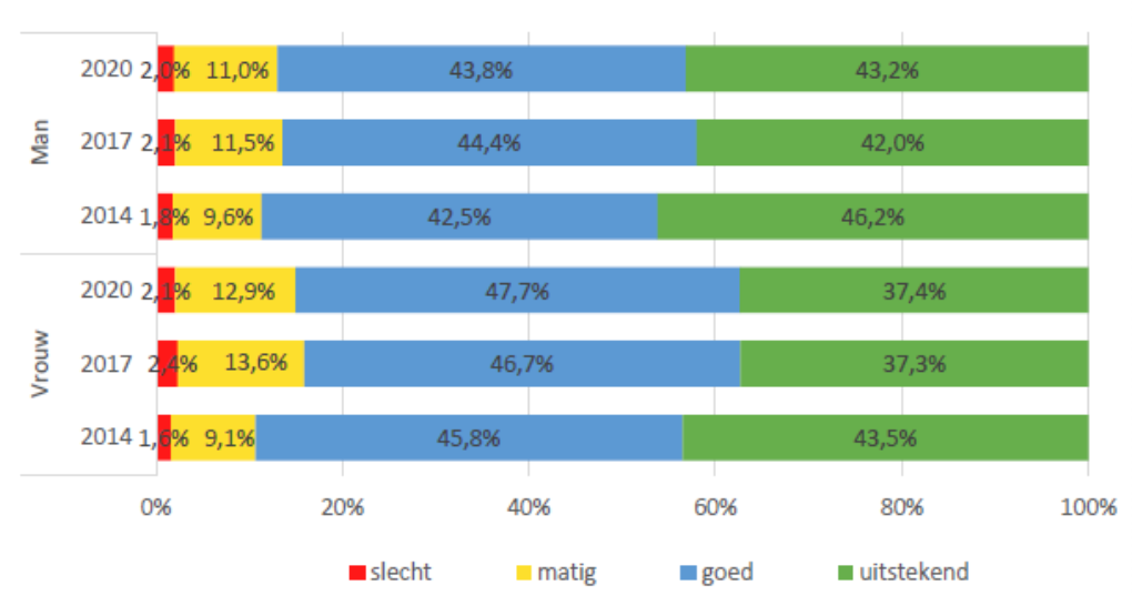 Figuur 1 geeft de werkvermogenscores voor de werknemers uit alle deelnemende organisaties over de periode van 2014 tot en met 2020 weer, opgesplitst naar geslacht. Hieruit blijkt dat het merendeel van de Nederlandse werknemers een ‘goed tot uitstekend’ subjectief werkvermogen rapporteert, maar dat het percentage werknemers dat de kwalificatie ‘uitstekend’ geeft sinds 2017 licht daalt en in 2020 weer stabiliseert. De daling in werkvermogen is bovendien sterker voor vrouwen dan voor mannen. Vrouwen rapporteren gemiddeld gezien een lager werkvermogen dan hun mannelijke collega’s.