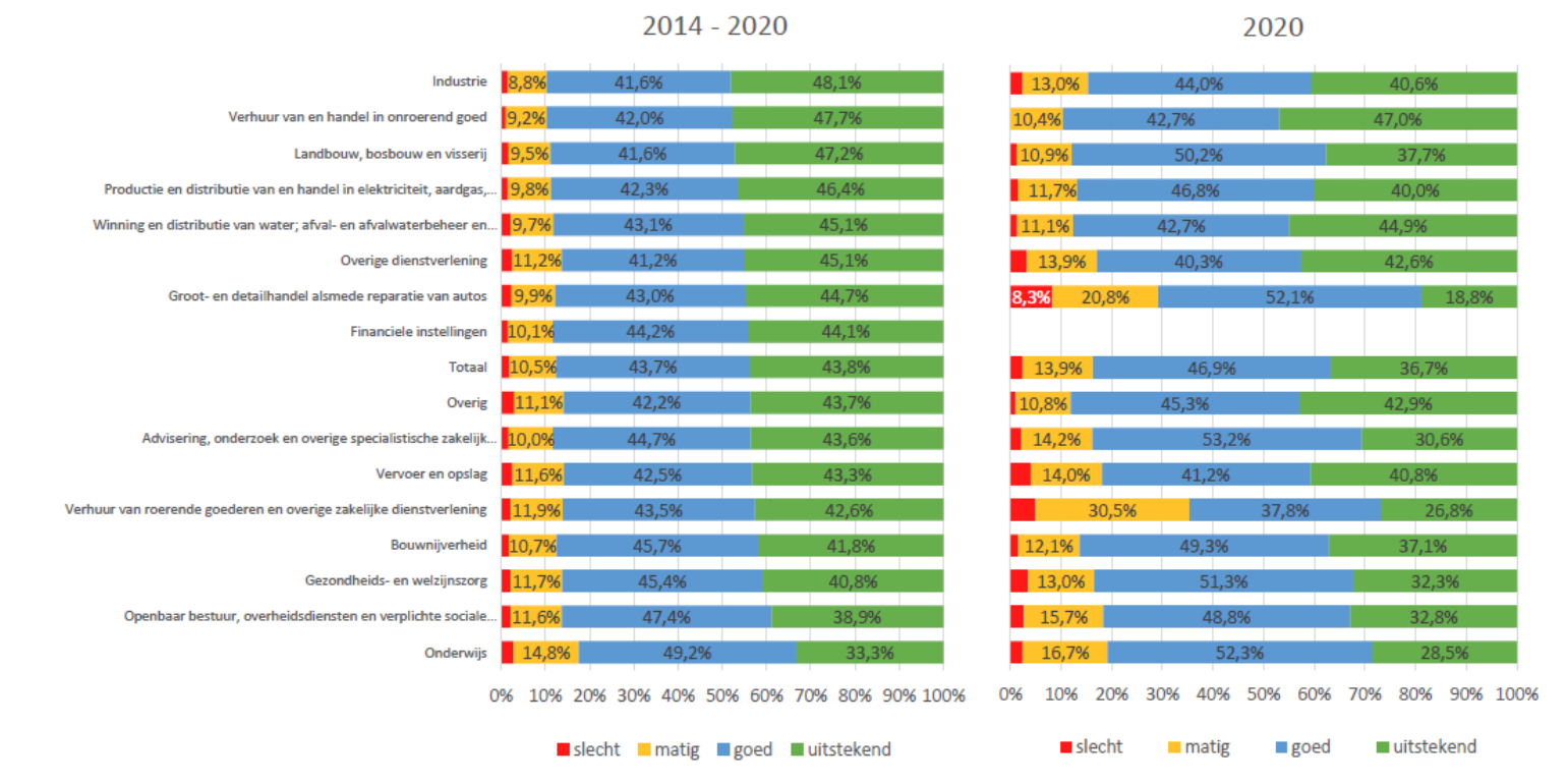 Er is ook variatie zichtbaar in de categorie ‘slecht tot matig’ werkvermogen voor de sectoren onderwijs, gezondheids- en welzijnszorg, en openbaar bestuur versus andere sectoren (gezien hogere percentage ‘slecht tot matig’ scorende werknemers (figuur 3). De WAI-scores in 2020 geven een ander beeld weer, met opvallend lagere werkvermogen-scores in de groot- en detailhandel alsmede reparatie van auto’s en in de sector verhuur van roerende goederen, bovenop de al eerder genoemde sectoren die relatief hoge percentages ‘slecht tot matig’ scorende werknemers hebben. Met andere woorden, het merendeel van de Nederlandse werknemers beschouwt in de huidige periode het eigen werkvermogen als relatief ‘goed tot uitstekend’, maar er is wel sprake van contextuele verschillen tussen de sectoren met ander type arbeid (geestelijk versus lichamelijke arbeid). Waarbij met name de sectoren met fysiek zware arbeid de laagste werkvermogen-scores weergeven (figuur 4).