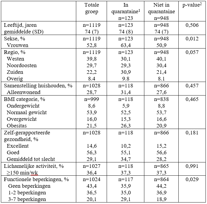 In tabel 1 zijn de kenmerken van de 1119 deelnemers weergegeven, waarbij er ook is opgedeeld naar wel/niet quarantaine. In totaal zijn 28 deelnemers gediagnosticeerd met COVID-19 en heeft 1 deelnemer een positieve test gehad. Drie deelnemers zijn opgenomen geweest in het ziekenhuis. Ruim 11% van de deelnemers (123 personen) is in quarantaine gegaan (mediane duur quarantaine: 21 dagen). Vrouwen en deelnemers met meer lichamelijke beperkingen gingen vaker in quarantaine.