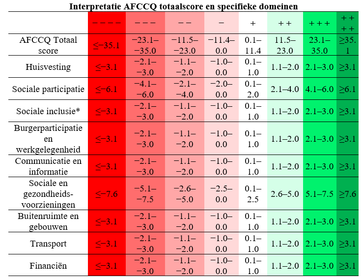De AFCCQ (Dikken et al., 2020ab) kan worden gebruikt voor onderzoek en beleidsdoelstellingen. De totaalscores variëren van -46 tot +46 punten, de berekening van deze punten staat verderop uitgelegd. De punten variëren tevens per domein, afhankelijk van het aantal deelvragen per domein. Om de interpretatie van resultaten te vereenvoudigen, is gekozen voor een methodiek van het kleurenschema, waarbij roodtinten staan voor negatieve resultaten, en groentinten voor positieve resultaten. Op deze wijze is het voor de lezer in een oogopslag helder hoe het staat met de seniorvriendelijkheid van een stad, wijk, of op een specifiek deeldomein. Op deze wijze kan ook worden gezien waar nog aanvullende acties wenselijk zijn. Uit rode vlakken spreekt altijd een bepaalde mate van urgentie voor een interventie, terwijl lichtgroene vlakjes ook nog ruimte bieden voor aanvullende beleidsmaatregelen.