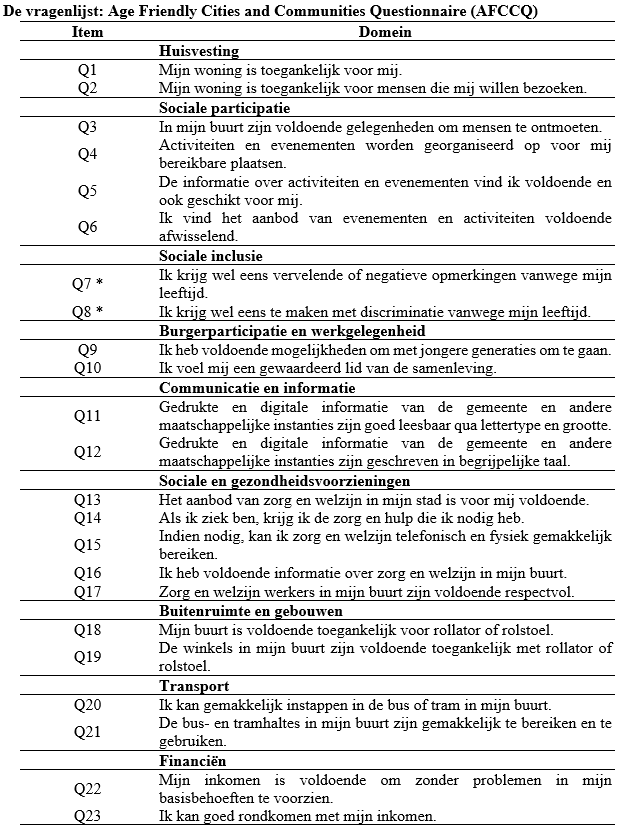 De nieuwe Age-Friendly Cities and Communities Questionnaire (AFCCQ) is ontwikkeld op basis van de criteria van de COnsensus-based Standards for selection of health Measurement INstruments (COSMIN) (COSMIN, 2020). Het volledige proces is terug te vinden in Dikken et al. (2020a). Een eerste set vragen die als uitgangspunt diende voor de ontwikkeling van de uiteindelijke vragenlijst is gemaakt op basis van een literatuurstudie, waarbij een interdisciplinair team van onderzoekers heeft samengewerkt. De basis voor het werk vormde de “Checklist of Essential Features of Age-Friendly Cities” van de WHO (2007). Hiervan wordt gezegd dat het ‘een tool is voor de zelfevaluatie van een stad om de eigen voortgang in kaart te brengen’. Ook zijn twee WHO-rapporten over seniorvriendelijke steden uit 2015 en 2018 gebruikt (WHO, 2015;2018). De relevante items zijn omgezet in vragen die konden worden beantwoord op een 5 puntsschaal (van geheel mee oneens tot geheel mee eens). Op basis van de internationale literatuur zijn aanvullende vragen gemaakt ten aanzien van de inzet van technologie en iemands financiële situatie. Deze domeinen worden in diverse documenten als belangrijk gezien. De gemaakte vragen zijn via een proces van onderlinge consensusvorming tot stand gekomen.
