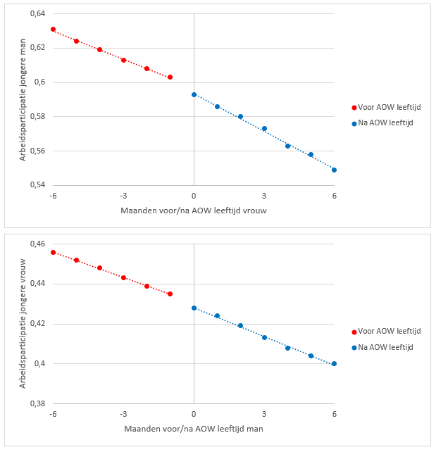 Het bereiken van de AOW-leeftijd door de oudere partner beïnvloedt vooral de eigen arbeidsparticipatie, maar in mindere mate ook de arbeidsparticipatie van de jongere partner. Hierdoor heeft een verhoging van de AOW-leeftijd twee effecten, namelijk voor de persoon zelf die geconfronteerd wordt met een hogere AOW-leeftijd en ook voor de jongere levensgezel.