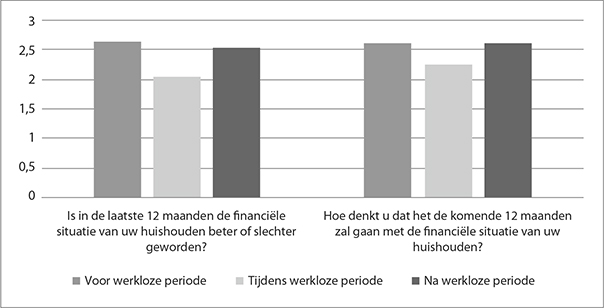 In het onderzoek naar levensloopbanen van werkloze 50-plussers, dat in de periode 2017-2018 uitgevoerd wordt, kijken we ook terug naar de periode voor de werkloosheid. In de analyse op basis van paneldata kijken we hoe mensen zich voelden op verschillende levensterreinen voordat ze werkloos werden, tijdens de werkloosheid en zo mogelijk na afloop van de werkloosheid. Een groot verschil met retrospectieve data is dat mensen voor de werkloosheid (in de meeste gevallen) niet wisten dat zij werkloos zouden worden. In hun antwoorden konden zij daar niet op anticiperen. Het LISS panel van CentERdata leent zich uitstekend voor een longitudinale analyse. De veranderingen die werkloosheid met zich meebrengt zijn met deze rijke dataset goed in beeld te brengen. Uit dit panel is een onderzoeksgroep samengesteld van mensen die op enig moment in de periode 2010-2017 50 jaar of ouder en werkloos waren. Voor deze groep kan, afhankelijk van het moment waarop ze werkloos werden en de duur van de werkloosheid, geanalyseerd worden wat hun ervaringen waren voorafgaand aan, tijdens en eventueel na afloop van de werkloosheid. Hier geven we de ervaring van de eigen financiële situatie weer, gevolgd door de ervaren gezondheid. Figuur 1 laat zien dat mensen tijdens de periode van werkloosheid hun eigen financiële situatie negatiever beoordelen dan daarvoor. Na de werkloze periode (voor zover dat van toepassing is) komt deze beoordeling ongeveer terug op het niveau van voor de werkloosheid.