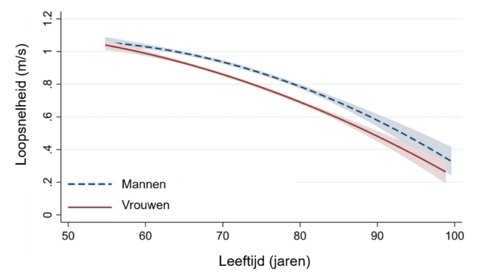 Onderzoekers van de Vrije Universiteit Amsterdam en het Rijksinstituut voor Volksgezondheid en Milieu hebben onderzoek gedaan naar de bijdrage van verschillende factoren op het vrouw/man verschil in loopsnelheid in Nederland onder ouderen. (Sialino et al., 2021). Voor deze studie zijn data van de Longitudinal Aging Study Amsterdam (LASA) gebruikt. Deze cohortstudie bevat gegevens van een nationaal representatieve ouderenpopulatie uit drie verschillende regio’s in Nederland (Amsterdam, Zwolle en Oss). In totaal zijn de gegevens van 2407 mannen en vrouwen van 55 jaar en ouder gebruikt, die elke 3-4 jaar opnieuw zijn gemeten. Het betreft twee geboortecohorten: het eerste cohort is in 1992 voor het eerst gemeten en is vervolgens 25 jaar gevolgd met maximaal acht herhaalde metingen per deelnemer. Het tweede geboortecohort is in 2002 voor het eerst gemeten en 15 jaar lang gevolgd met maximaal vijf herhaalde metingen per deelnemer. De totale steekproef had gemiddeld vier metingen per persoon.