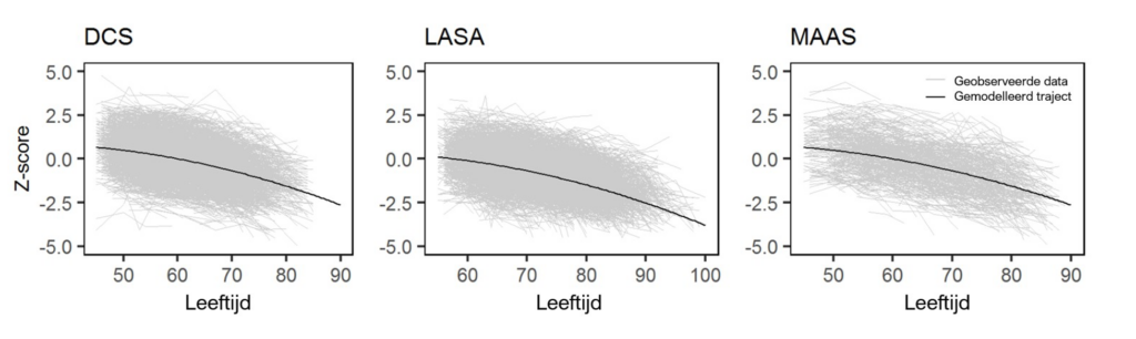 We bundelden de krachten van drie Nederlandse cohortstudies met informatie over meerdere risicofactoren, en die informatieverwerkingssnelheid over een lange tijd gemeten hadden. Ten eerste, de Longitudinal Aging Study Amsterdam (LASA; zie www.lasa-vu.nl), die sinds 1992 het lichamelijk, cognitief, emotioneel en sociaal functioneren van 55-plussers in de regio’s Amsterdam, Zwolle en Oss in kaart brengt. Metingen vinden elke drie tot vier jaar plaats. We konden gegevens van 3.767 deelnemers analyseren. Ten tweede, de Doetinchem Cohort Studie (DCS; zie www.rivm.nl/doetinchem-cohort-studie), die sinds 1987 vergelijkbaar onderzoek doet in de stad Doetinchem bij mensen die destijds tussen de 20 en 59 jaar oud waren. Metingen vinden elke vijf jaar plaats en wij gebruikten gegevens vanaf de meting in 1995 voor deelnemers die toen 45 jaar of ouder waren. We analyseerden gegevens van 4.746 deelnemers. En ten derde, de Maastricht Aging Study (MAAS; zie https://www.maastrichtagingstudy.nl/), een studie die startte in 1995 en gegevens verzamelde over 50-plussers in de stad Maastricht. Wij gebruikten gegevens van vier metingen, afgenomen gedurende 12 jaar van in totaal 1.133 deelnemers.