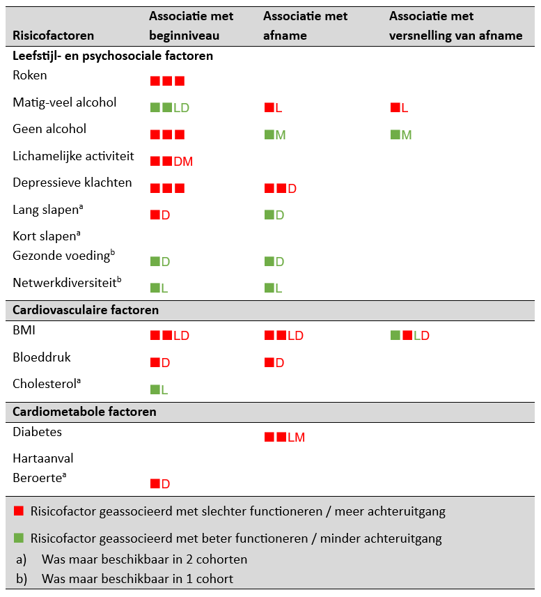Tabel 1. Associaties tussen risicofactoren en het beginniveau, de afname en de versnelling van afname van informatieverwerkingssnelheid. Het aantal blokjes geeft aan in hoeveel van de cohorten (LASA, DCS, MAAS) deze associatie werd gevonden. Als een effect niet in alle cohorten werd gevonden, geven de letters aan in welke cohorten wél een effect werd gevonden (L=LASA, D=DCS, M=MAAS). N=9.666.