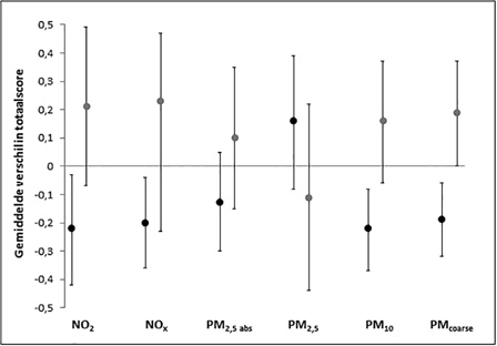 Figuur 1 Associaties tussen luchtvervuiling en objectief gemeten fysiek functioneren (zwarte punten) en ervaren fysiek functioneren (grijze punten) van ouderen in Nederland. De associaties worden gepresenteerd als gemiddelde verschil in totaalscore met 95% betrouwbaarheidsintervallen bij een toename van de luchtvervuiling ter grootte van een interkwartielafstand (zie ook De Zwart e.a., 2018 [literature id="1"] ). a,b