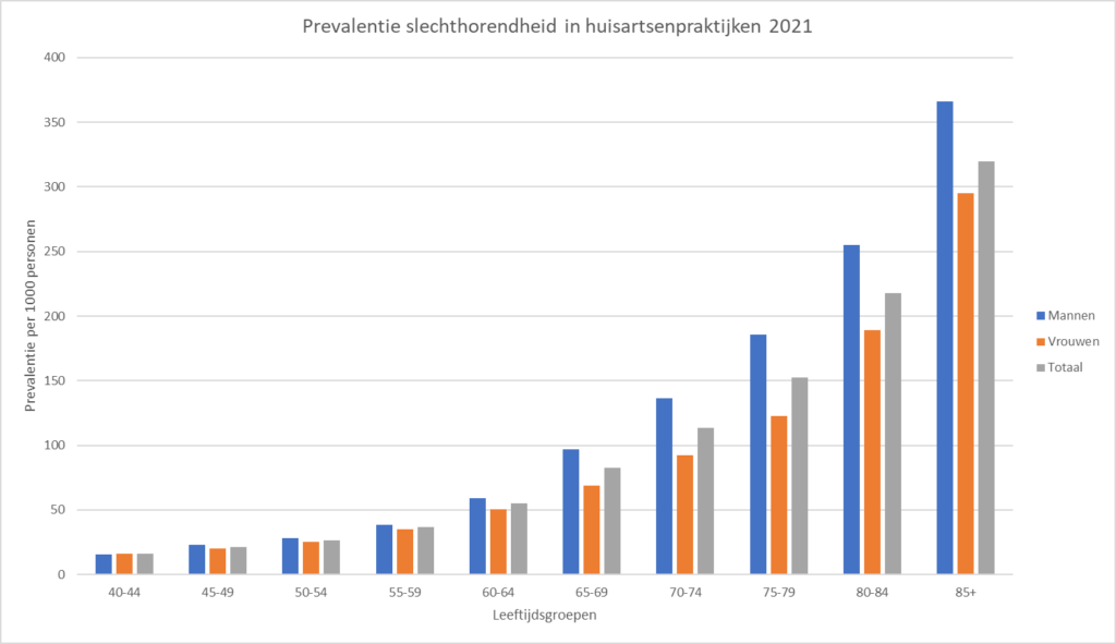 Figuur 1. Prevalentie slechthorendheid in huisartsenpraktijken in 2021. Bron: RIVM VZinfo. Gehoorstoornissen. https://www.vzinfo.nl/gehoorstoornissen.