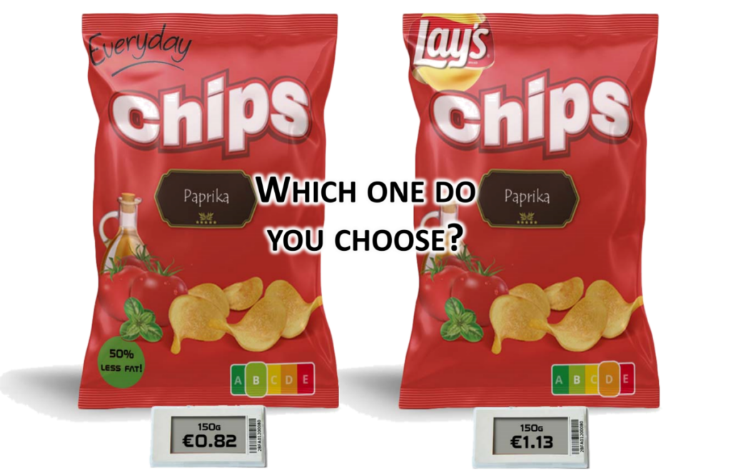 Een tweede factor is prijs. Het is logisch dat we dit mee onderzoeken, want de prijs speelt een rol in veel voedingskeuzes. Maar het kan ook erg interessant zijn om eens naar de Nutri-Score te kijken zonder dat de prijs zich komt moeien.
