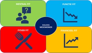 Figuur 1 visualiseert het vier-factoren-model van inzetbaarheid van werknemers. Dit 4FM-model geeft een integraal beeld van de relevante fitheden, als basis voor de centrale dialoog tussen werkgever en de individuele werknemer over het onderhoud van zijn of haar inzetbaarheid. Daarbij ligt de focus op het fit zijn voor de huidige en toekomstige functie (kennis, vaardigheden en houding), het fysiek en mentaal fit zijn, en de financiële fitheid (mate waarin de financiële situatie overeenkomt met huidige en toekomstige verplichtingen en wensen).