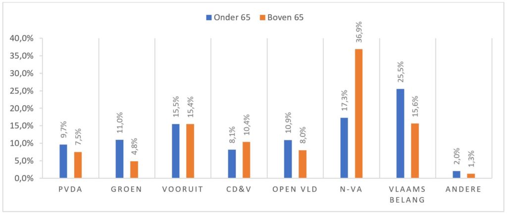 Het grootste verschil tussen jong en oud bevindt zich aan de rechtse kant van het politieke spectrum. Bij kiezers onder de 65 is het aandeel van Vlaams Belang met 25,5% van de stemmen veruit het grootste, tegenover ‘slechts’ 17.3% voor N-VA. Bij de oudere bevolking zien we het omgekeerde beeld: hier haalt Vlaams Belang 15,6% en is N-VA veruit de grootste partij met 36,9%. De N-VA is dus van alle partijen het meest een ouderenpartij.