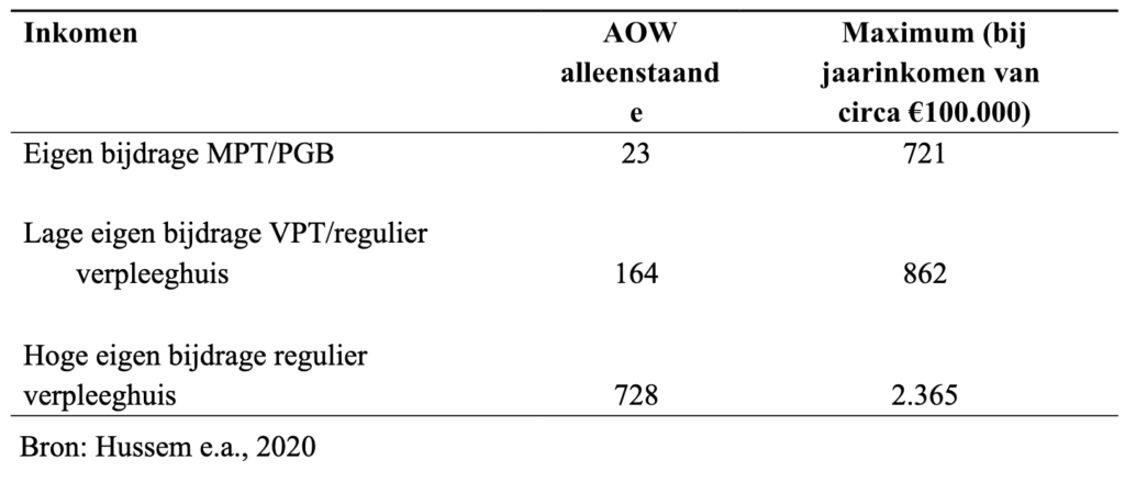 Iedereen die zorg ontvangt die gefinancierd is op grond van de Wet langdurige zorg (Wlz) betaalt een eigen bijdrage. Die eigen Wlz-bijdrage is afhankelijk van inkomen, vermogen, leeftijd (65-plus), huishoudenssituatie en het type zorg. Er bestaat een lage en een hoge eigen bijdrage. De lage eigen bijdrage is van toepassing op PGB, VPT, MPT, op de eerste vier maanden in een regulier verpleeghuis of als de partner thuis woont. De hoge eigen bijdrage geldt in alle overige gevallen. Via de hoge eigen bijdrage betalen mensen dus ook in een regulier verpleeghuis zelf mee aan de woonlasten naast de zorglasten. Het verschil tussen de hoge en lage eigen bijdrage is €564 voor een alleenstaande met een AOW-uitkering en €1.503 per maand wanneer de maximale eigen bijdrage betaald moet worden (tabel 1).