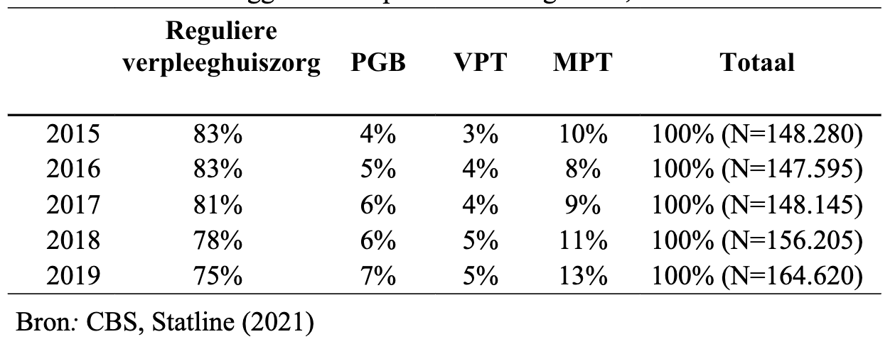 In 2015, 2016 en 2017 gebruikten rond 148.000 mensen Wlz-gefinancierde ouderenzorg. Dat aantal steeg in 2018 en 2019 naar respectievelijk 156.000 en 165.000 (stand begin januari) (tabel 2). Dit blijkt uit data die beschikbaar zijn via het Centraal Bureau voor de Statistiek (CBS). Ongeveer 11.000 van hen kozen in 2019 voor een PGB, 23.000 voor een MPT en 9.000 voor een VPT, totaal 26%. In 2015 ging het nog om 17%. Het gebruik van deze regelingen neemt dus toe.