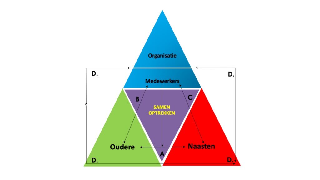 De laatste jaren bestaat er in de zorg voor ouderen steeds meer aandacht voor de driehoek van relaties tussen de oudere, diens naaste en de professional. In dit model vormt de bestaande relatie van oudere (cliënt, bewoner) en naaste de basis, ook al verandert deze relatie door bijvoorbeeld ziekten, veranderde rollen en andere omgeving. In het kader van persoonsgerichte zorgverlening brengen professionals in kaart wie de familie van een cliënt is en proberen ze rekening te houden met de wensen van de cliënt om die relatie in stand te kunnen houden. In de driehoek staan de andere twee (gelijke!) zijden van de driehoek voor de relaties van respectievelijk de oudere met medewerkers én van de naasten met medewerkers. In die driehoek trekken deelnemers idealiter samen op voor een goede kwaliteit van leven van de oudere, in gelijkwaardige samenwerking vanuit betekenisvolle relaties.
