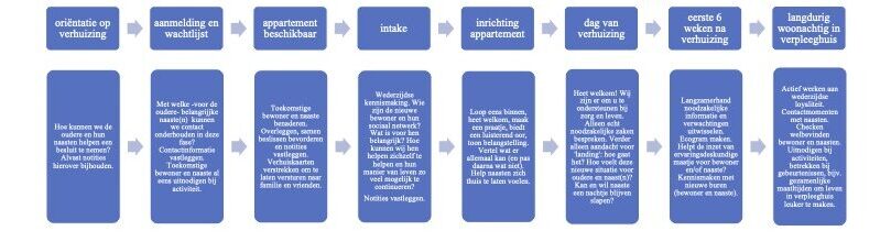 Hoewel er de afgelopen jaren de nodige kennis, inzichten en materialen zijn ontwikkeld om de relaties tussen ouderen, naasten en medewerkers in de zorg te bevorderen, worden de resultaten weinig gebruikt in de praktijk. Als zorg- en werkprocessen worden geoptimaliseerd is geen expliciete aandacht voor (gevolgen voor) de relaties in de triade. In ons project zagen we op één van de locaties dat bij de geplande ‘optimalisatie inhuizing bewoners’ de organisatie en de bedrijfsprocessen centraal stonden en weinig aandacht was voor de relationele aspecten. Nu ontwikkelen we parallel aan de gewenste werkprocessen gewenste relatie-processen. Dit doen we aan de hand van belangrijke momenten in de ‘bewonersreis’ door de wereld van de langdurige intramurale zorg (zie het voorbeeld in figuur 2). Een dergelijke reisbeschrijving helpt zorgverleners en organisaties zich te realiseren dat zíj degenen zijn die binnentreden in het leven van ouderen en hun naaste(n), in plaats van andersom. Ook biedt het een handvat om de betrokkenheid van naasten bij de organisatie te kunnen vergroten.