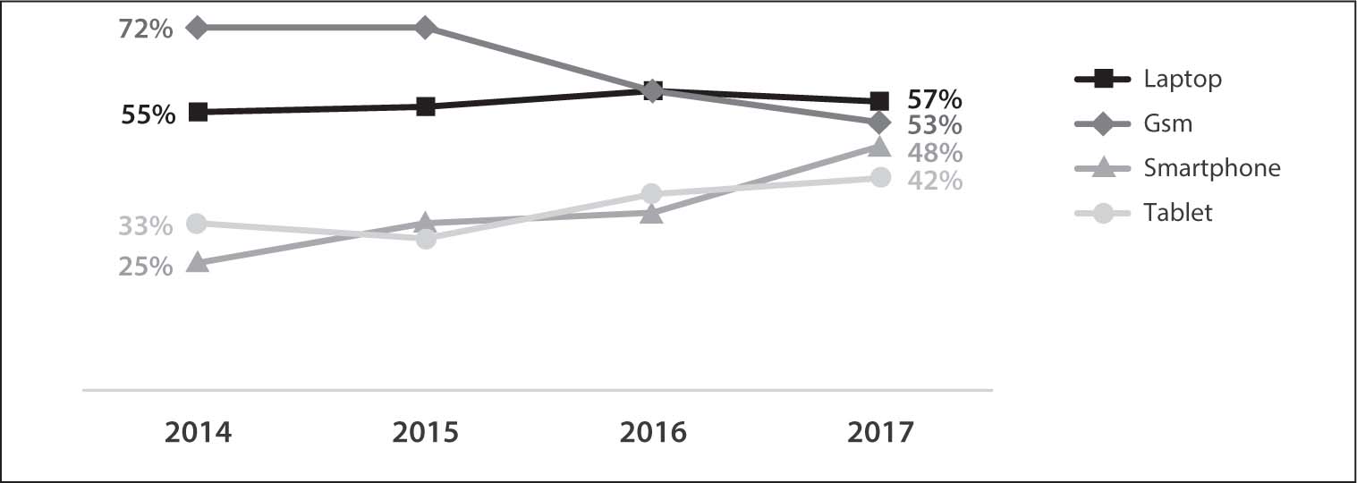 Figuur 1. Bezit digitale toestellen bij 65-plussers. Evolutie 2014-2017