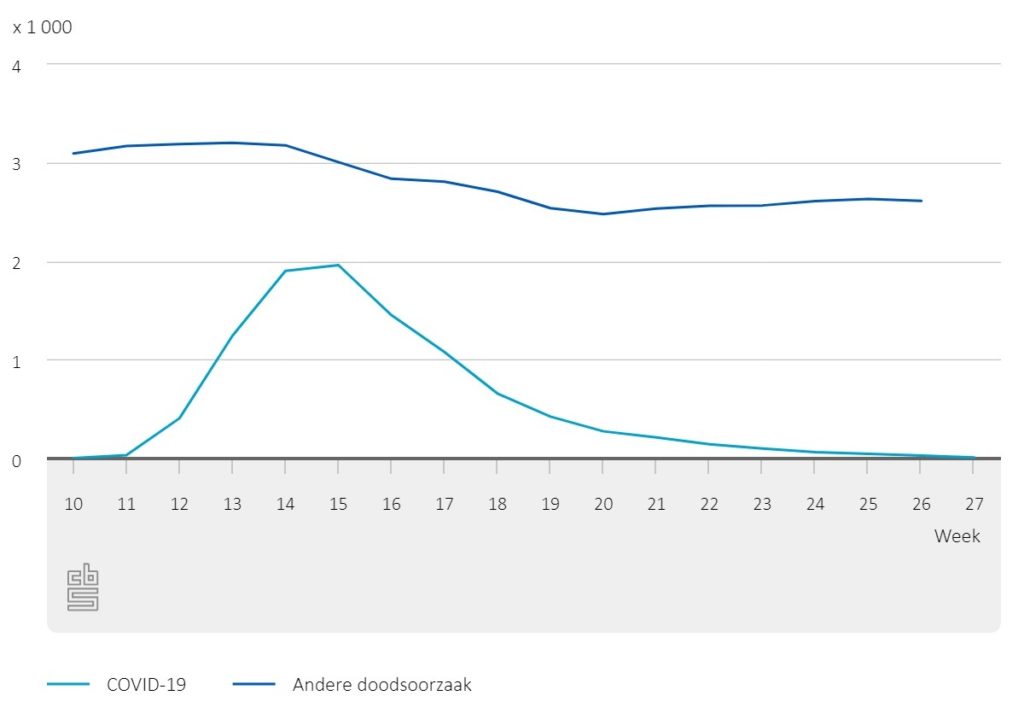 Figuur 1. Overledenen in 2020, week 10 t/m 27 (maart tot en met juni)