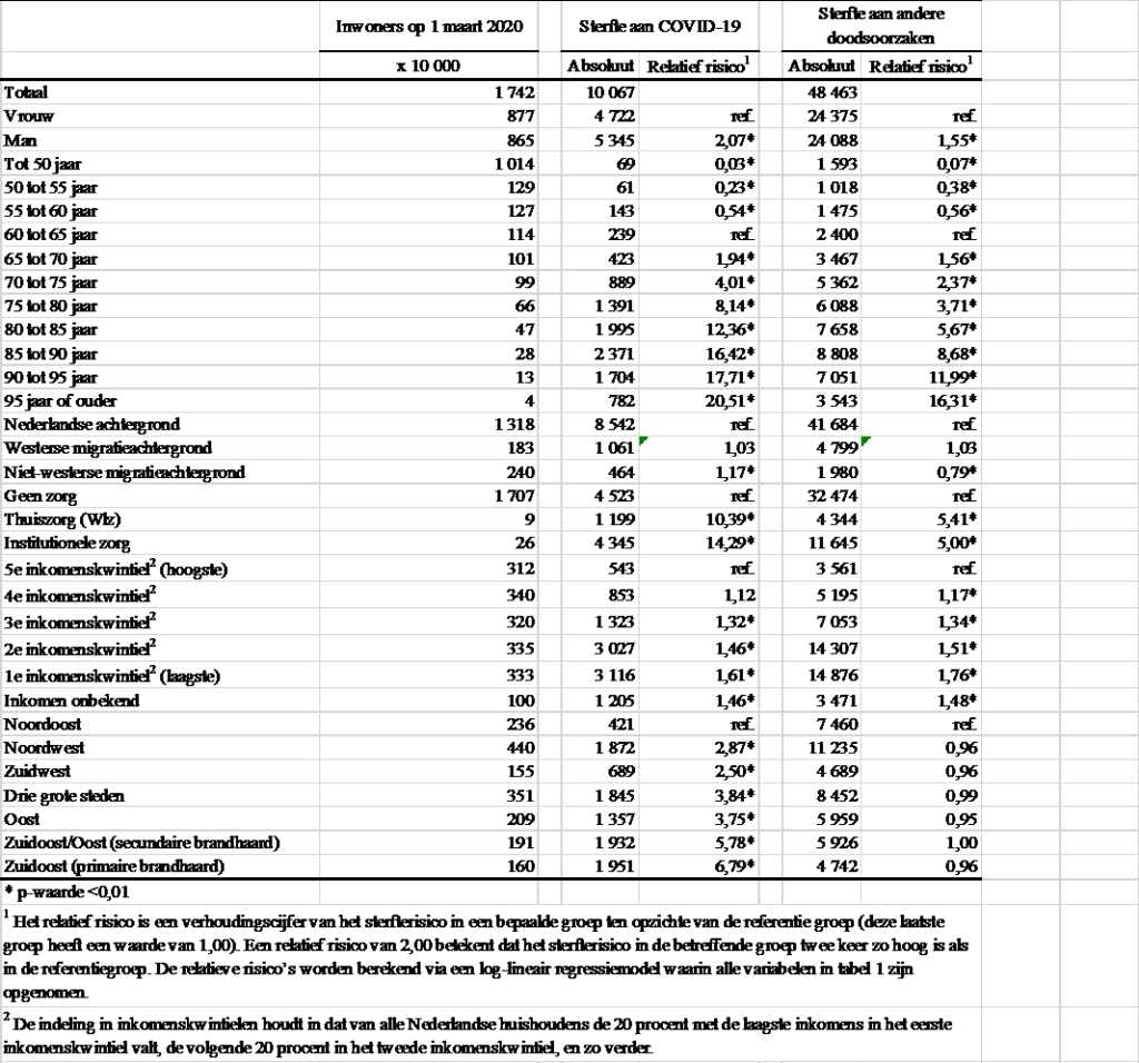 In tabel 1 is de sterfte aan COVID-19 en andere doodsoorzaken tussen 1 maart tot en met 30 juni 2020 weergegeven. Daarnaast zijn de uitkomsten van het regressiemodel weergegeven, in de vorm van het relatief risico. Dit is een verhoudingscijfer van de kans op overlijden aan COVID-19 of andere doodsoorzaken in een bepaalde groep ten opzichte van een referentiegroep. Het relatief risico wordt berekend na controle van alle andere factoren in de tabel (geslacht, leeftijd, type zorg, migratieachtergrond, inkomen en regio).