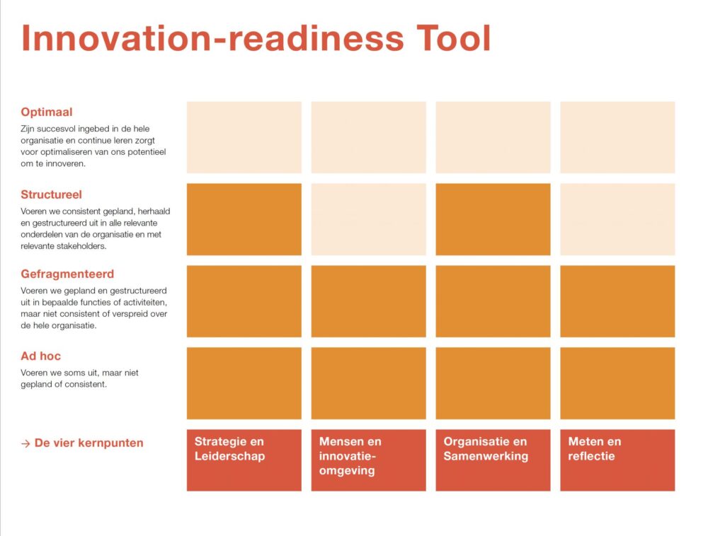 Sevagram bracht indicatoren, bedoeld om op het eigen niveau van innovation readiness te reflecteren, onder in een “Innovation Readiness Tool” (zie figuur 2).  Deze tool bestaat uit vier kernpunten en vier gradaties (geïnspireerd op INSEAD, 2009), lopend van ‘ad hoc’ naar ‘optimaal’. De mate van innovation readiness van de organisatie wordt bepaald door de mate waarin structuur, processen en acties gericht op innoveren zijn ingebed in de gehele organisatie, de daadwerkelijke implementatie van innovaties bereikt is en er geleerd wordt van ervaringen om het potentieel tot innoveren te vergroten. In figuur 2 illustreren de oranje vakjes hoe Sevagram op het eigen niveau van innovation readiness in 2021 scoorde.