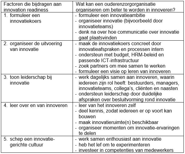Voor elke ouderenzorgorganisatie is het belangrijk nieuwe werkwijzen, producten of diensten te implementeren die voldoen aan de behoeften van cliënten en medewerkers. Snelle veranderingen in de ouderenzorg nopen ouderenzorgorganisaties tot beter worden in innoveren. De capaciteit van een organisatie en haar professionals om te innoveren wordt innovation readiness genoemd (Tidd & Bessant, 2009). Voor zorgorganisaties is professioneel en gestructureerd uitvoering geven aan innoveren een uitdaging. Structuren, processen, systemen en competenties zijn namelijk vooral gericht op het bieden van kwalitatief hoogwaardige zorg.