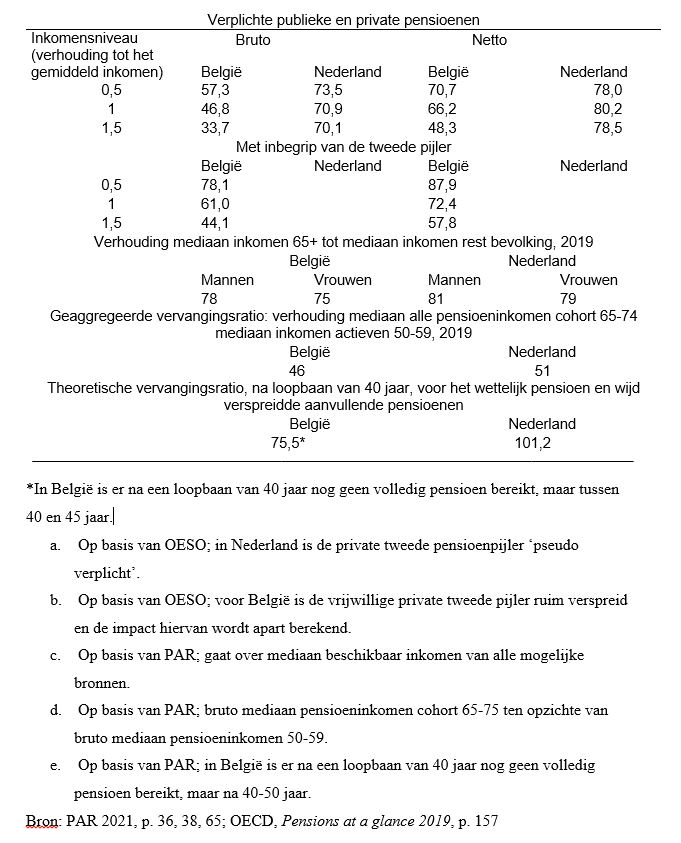 Nederland heeft een zeer sterke staat van dienst op het gebied van toereikendheid van pensioenen (SPC/EC, 2021a; Mercer, 2020). De eerste pensioenpijler betreft het verplichte basispensioen. In België is dat het wettelijk pensioen, in Nederland de AOW (Algemene Ouderdoms Wet). De tweede pensioenpijler omvat de aanvullende pensioenen voor werkenden. België laat het afweten in de hoogte van het wettelijk pensioen voor de midden en hoge inkomens, en dit vooral doordat de wettelijke pensioenuitkering wordt berekend op een geplafonneerd loon, terwijl de pensioenpremie geen loonplafond kent, althans voor de werknemers (Pacolet, 2021). Het PAR gebruikt verschillende ratio’s om de adequaatheid van de vervangingsvoet te bepalen. In tabel 1 hebben we die aangevuld met OESO-cijfers. De cijfers van de OESO illustreren dat de vervangingsvoet voor de gemiddelde en hogere (1,5 keer het gemiddelde) inkomens laag is in België, terwijl die vooral netto gunstig is voor de lage inkomens (0,5 keer gemiddeld inkomen) door de gunstige fiscale behandeling, en voor de midden en hogere inkomens wel wordt opgekrikt door de tweede pijler. In 2019 waren de mediane inkomens van 65-plussers ten opzichte van de rest van de bevolking en van de 65-74-jarigen ten opzichte van de actieve 50-59-jarigen – zowel voor mannen als vrouwen – in België 4 à 5 procentpunten lager dan in Nederland. Het mediaan inkomen is het niveau van het inkomen dat de inkomensontvangers in twee gelijke groepen verdeelt: 50% van de inkomensontvangers verdient minder en 50% van de inkomensontvangers verdient meer. De theoretische vervangingsratio illustreert verder het verschil in de generositeit van het pensioenstelsel tussen België en Nederland, als aan de voorwaarden van een lange loopbaan en een tweede pijler is voldaan. De tanende generositeit naar de toekomst toe in Nederland blijkt uit het feit dat deze ratio tegen 2059 daalt tot ongeveer 80%. Voor België blijft de ratio constant (PAR, 2021). Het PAR hield hierbij rekening met de pensioenhervormingen gekend tot 1 juli 2020.