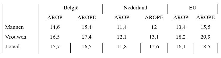 Tabel 2. Armoederisico (AROP) en risico op armoede en/of sociale uitsluiting (AROPE) van ouderen (65-plussers) naar geslacht in België, Nederland en de Europese Unie in 2019