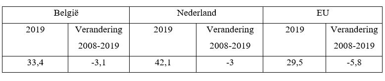 Tabel 3. Pensioenkloof tussen vrouwen en mannen in België, Nederland en de Europese Unie in 2019 en verandering 2008-2019, in procenten