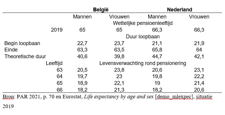 Tabel 4. Standaard pensioenleeftijd, duur loopbaan en levensverwachting in jaren rond pensionering van vrouwen en mannen in België en Nederland, 2019