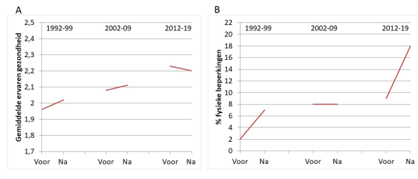 In de opeenvolgende decennia nam de ervaren gezondheid gemiddeld iets af, maar vertoonde geen verandering rond de uittreding (figuur 1). Het aandeel werkenden met lichamelijke beperkingen nam vóór de uittreding toe, en ook was de toename pre-post-exit sterker in de jaren 2010 dan in eerdere decennia. Deze veranderingen vonden evengoed plaats bij werkenden met gunstige als met ongunstige arbeidsomstandigheden.