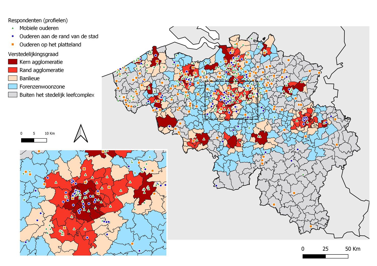 De respondenten in het profiel ‘mobiele ouderen’ zijn in het algemeen hoog opgeleid, hebben een hoog inkomen, een goede fysieke gezondheid en beschikken over een auto en een fiets. Hoewel ze over een breed gamma aan vervoersopties beschikken – en dus als mobiel beschouwd kunnen worden – verplaatsen ze zich gemiddeld minder dan andere Belgen. Dit lijkt deels een bewuste keuze te zijn en wordt mogelijk verklaard door een kleinere noodzaak om zich te verplaatsen of een verminderd sociaal netwerk. Buiten hun leeftijd hebben zij geen uitgesproken karakteristieke kenmerken. Daardoor werd dit profiel als referentie gebruikt om de andere profielen op basis van verschillen in attitudes en percepties mee te vergelijken. Figuur 2 toont de ruimtelijke spreiding van de drie profielen.