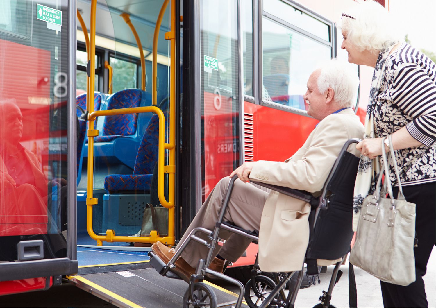 Figuur 1. Een ouder persoon met rolstoel wordt de bus in geholpen