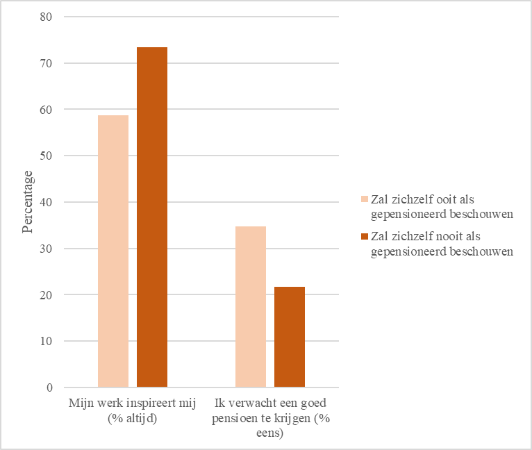 De gegevens in figuur 2 laten zien dat beide aspecten een rol spelen. Zzp’ers die aangeven zichzelf nooit als gepensioneerd te gaan beschouwen zijn relatief bevlogen in hun werk. Van de zzp’ers die de identiteit als gepensioneerde verwerpen geeft bijna driekwart aan dat het werk hen (bijna) altijd inspireert. Onder zzp’ers die één van de andere definities van pensionering hebben gekozen, is dit percentage lager (59 procent).