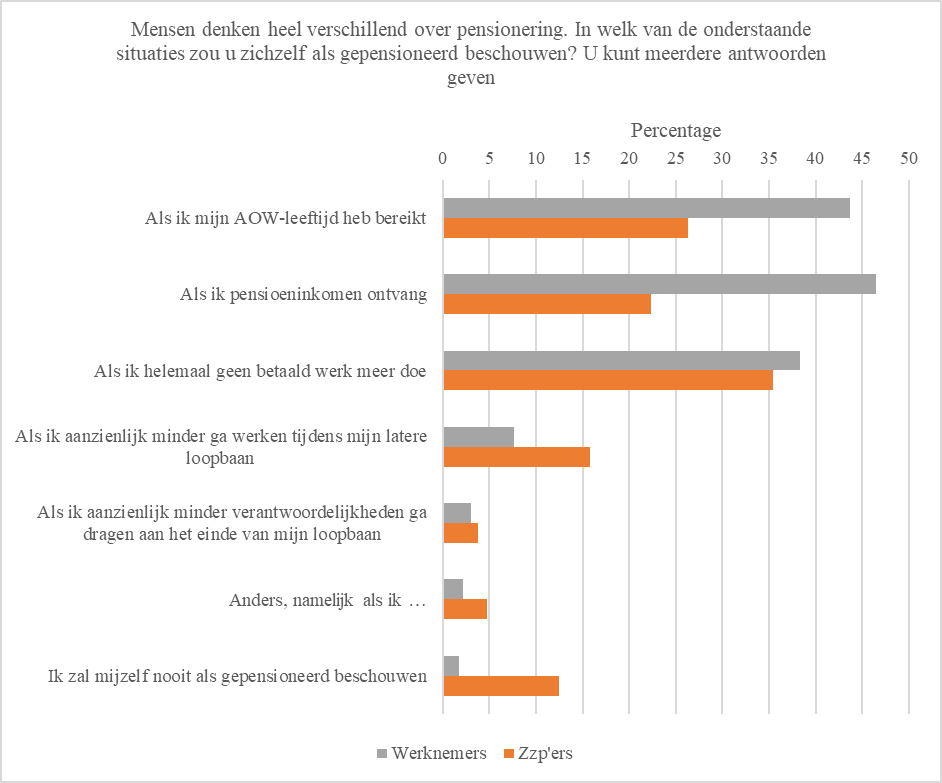 In de zzp-groep is het – zoals al werd verwacht – gebruikelijker om te kiezen voor niet-traditionele definities van pensionering. Zo kiezen meer zzp’ers voor de optie ‘als ik aanzienlijk minder ga werken tijdens mijn latere loopbaan’ (16 procent) dan werknemers (8 procent). Ook de optie ‘ik zal mijzelf nooit als gepensioneerd beschouwen’ wordt aanzienlijk vaker gekozen door zzp’ers (12 procent) dan door werknemers (2 procent). Gemiddeld genomen vinken werknemers iets meer antwoordopties aan dan zzp’ers (gemiddeld 1,43 voor werknemers en 1,21 voor zzp’ers).