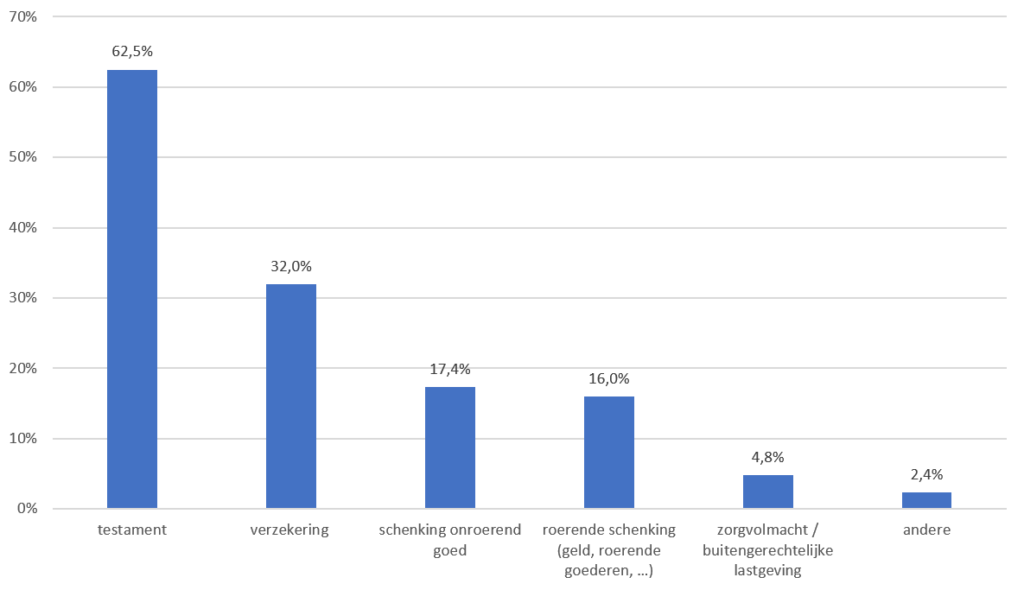 Wanneer Belgen beslissen om hun nalatenschap te regelen, zullen ze in meer dan 60% van de gevallen opteren voor een testament! Op de tweede plaats staan de verzekeringen (overlijdens- of begrafenisverzekering) en de schenkingen van zowel roerende als onroerende goederen (figuur 2).