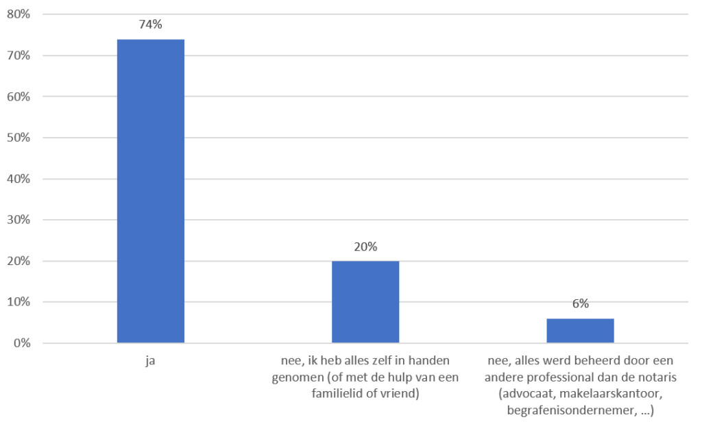 De grote meerderheid van de Belgen (74%) doet rechtstreeks een beroep op een notaris voor hun erfopvolging. Over het algemeen gebeurt dit omdat ze geen andere mogelijkheden kennen. 20% kiest ervoor om het zelf te regelen, wat absoluut mogelijk is voor relatief eenvoudige gevallen. Het overige deel gaat naar een andere specialist dan de notaris, bijvoorbeeld een bedrijf dat gespecialiseerd is in nalatenschappen, zoals advocaat, makelaar of begrafenisondernemer.