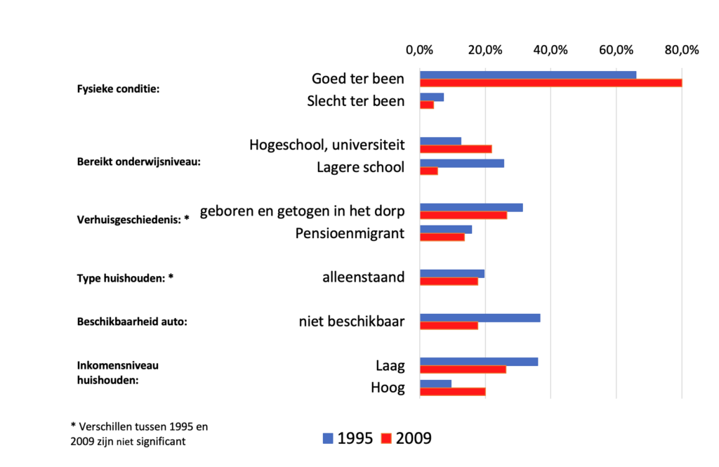 De verschillen tussen 1995 en 2009 in achtergrondkenmerken van de ouderen in het onderzoeksgebied zijn aanzienlijk (figuur 1), naar leeftijd en geslacht zijn er geen significante verschillen.